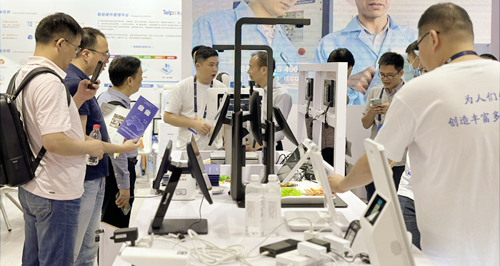 天波信息展位以数字商业、数字政务与数字医疗三大场景,带来双屏收银机C8、桌面式自助收银机K106、团餐消费机C31、配送机器人、手持扫码终端M1、人脸身份识别终端F2、手持身份核验平板S8、AI核身摄像头V503、医保电子凭证终端C10T、边缘计算盒子V1、IPC摄像头V61等30多款智能硬件产品,吸引观众亲身体验天波产品的卓越性能,更有智能配送机器人在展会现场巡逻递名片。
