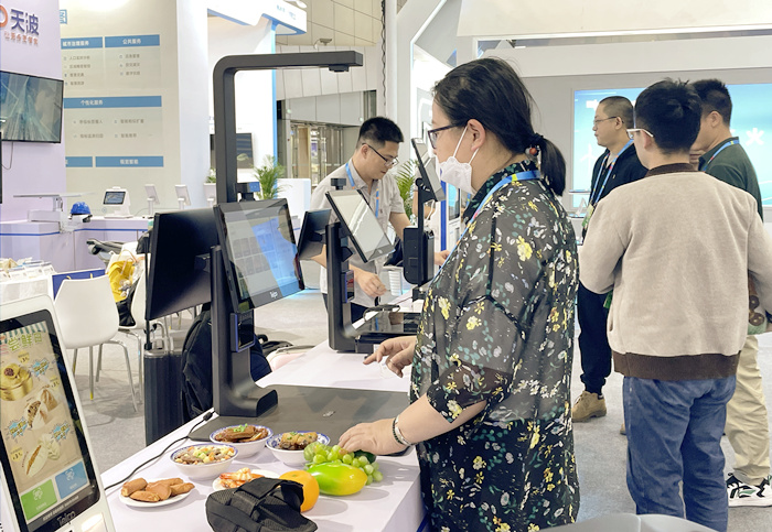 展会手填,天波信息更现场发布了AI视觉识别收银秤C20X!AI视觉识别收银秤C20X能实现团餐和生鲜零售两大场景的视觉识别功能,根据算法和配置不同,既可支持视觉识别蔬菜水果种类,也可支持团菜菜品结算功能,无需外置边缘计算盒子,功能更多样化。