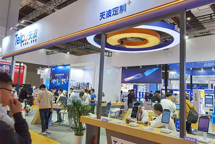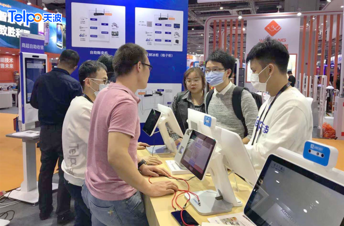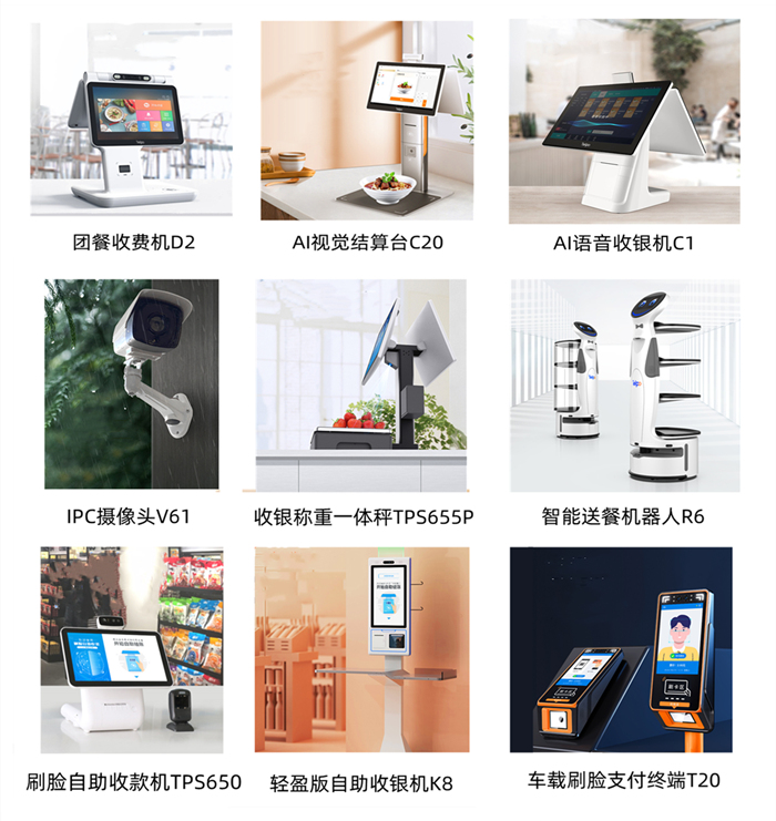 在天波展位,你可以看到大屏自助收银机TPS700、轻盈版自助收银终端K8、迷你自助收银机K10、AI视觉结算台C20、智能视觉识别收银秤TPS655P、智能车载支付终端T20、IPC摄像头V61等智能硬件设备。