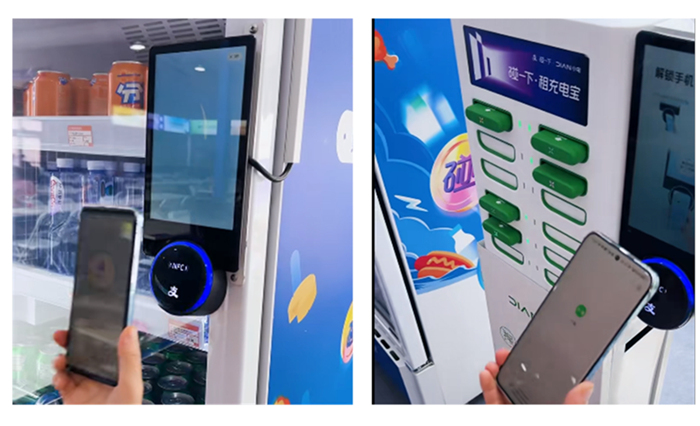 天波目前已落地应用的“碰一下”终端就包括自助售货机上的支付终端,以及共享充电宝租用柜的“碰一下”终端,碰一下就能迅速响应,无需打开手机APP扫码,一碰到位,交互体验更优。