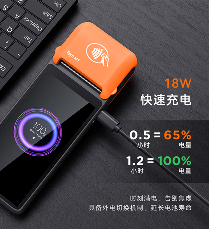 天波智能手持移动POS终端M1外形时尚、操作感顺滑、安全、满足高性能指标、打印速度快、电池续航能力强、并通过GMS认证,支持NFC识别,接受IC卡、磁条卡、会员卡、二维码等多种收款方式,可广泛应用在国内外餐饮、零售、物流的移动点餐、库存管理、快递派送等行业场景。