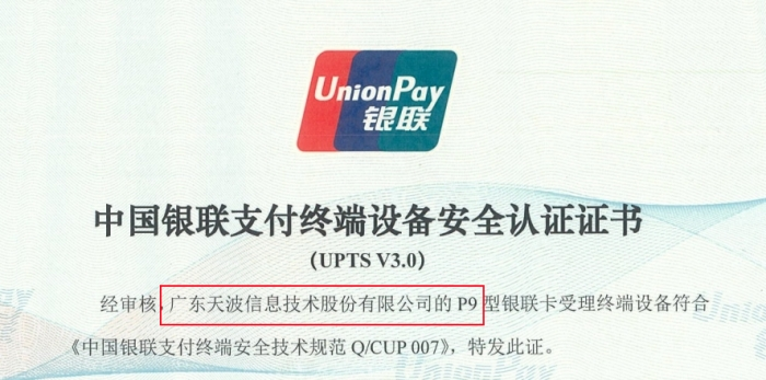 中国银联支付终端设备安全认证是支付行业公认的“安全金标”,涵盖硬件安全、数据加密、交易防篡改等200余项严苛测试。天波信息研发的手持智能终端P9通过检测,正式获得《中国银联支付终端设备安全认证证书》,这意味着天波P9在支付安全与技术合规性上获得业界权威认可。