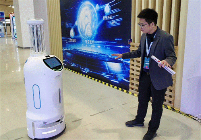 围绕在天波展位周围的,还有一个在“冒烟”的机器人。原来这是天波研发制造的用于医院消毒杀菌场景的智能机器人,头顶上冒出的这股“烟”,就是它的消毒喷雾,它可以24小时自动巡逻喷洒消毒喷雾,省时又节省人力。