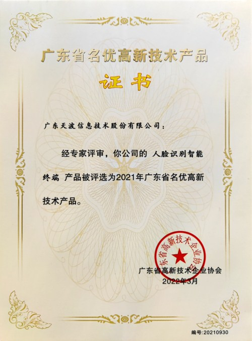 2022年伊始,广东省高新技术企业协会公布了最新的省名优高新技术产品获奖名单。。广东天波凭借智能人脸识别终端获得了权威行业认可,被评为“2021年广东省名优高新技术产品”。