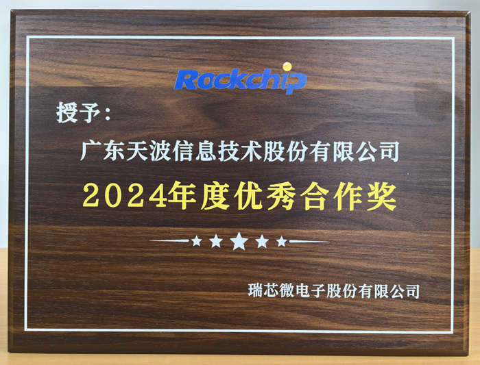 近日,广东天波信息技术股份有限公司(简称“天波信息”)凭借与瑞芯微在深度合作中的卓越表现,荣获瑞芯微2024年度优秀合作奖。这一奖项不仅是对天波信息与瑞芯微长期合作成果的肯定,更是对天波信息在技术创新、产品研发及市场拓展等多方面综合实力的认可。