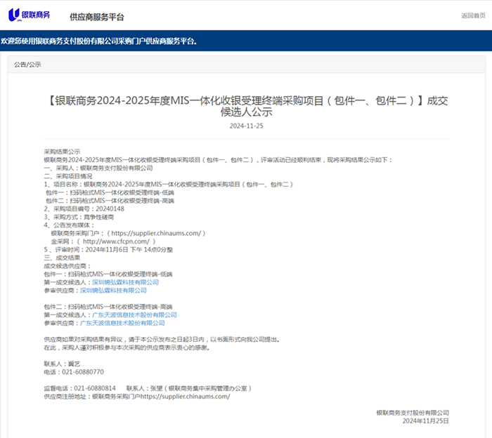 经过严格评审环节,广东天波信息技术股份有限公司(简称“天波信息”)成功中标银联商务2024-2025年度MIS一体化收银受理终端采购项目——扫码枪式MIS一体化收银受理终端(高端),并已于11月25日进行公示。