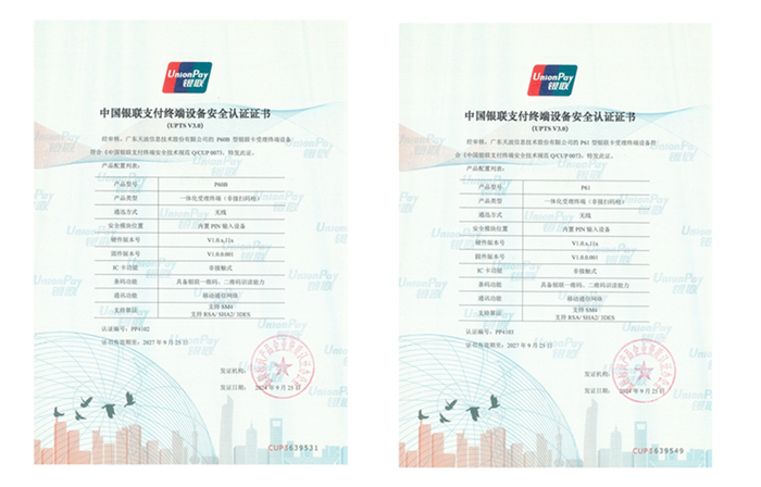 天波两款MIS收银一体式扫码枪P60B和P61达到银联对MIS一体化收银支付受理终端的严格标准,获”中国银联支付终端设备安全认证证书”。